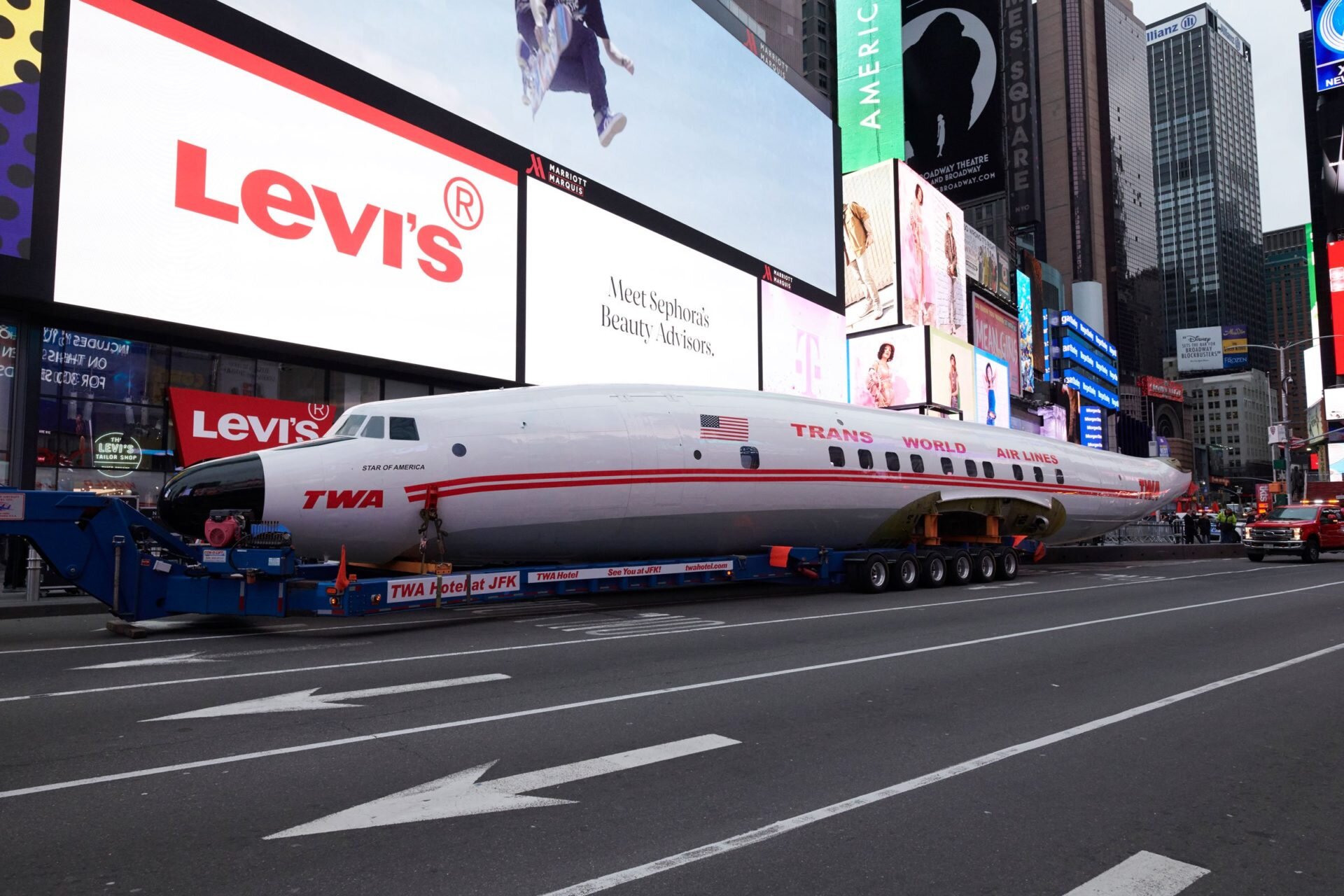 In March 2019, we partnered with TWA and MCR to stage a 1958 “Constellation Connie” aircraft in Times Square. This stunt was part of a documentary filming to promote the building of the new TWA Hotel at JFK. This 116 ft vintage aircraft will now be a full-service cocktail bar residing at the new hotel.